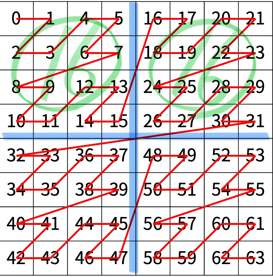 각 사분면의 경계를 기준은 2^N / 2 의 값이 연관되어 있는데 좌표를 표기 한다면 아래와 같다.